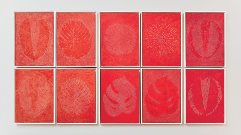 Nel corso degli anni Novanta il suo interesse materico si estende all’impiego della lastra di ferro, spesso posta in relazione dialettica con la carta, per approdare in seguito all’uso di un materiale naturale, la foglia, a cui vengono riconosciuti forma e valore scultoreo. La foglia viene forata, inserita in cornici che hanno una funzione architettonica, usata come matrice - ombra, calco, traccia - fino a diventare soggetto di una serie di grandi disegni su carta sottile, le cosiddette antropometrie.