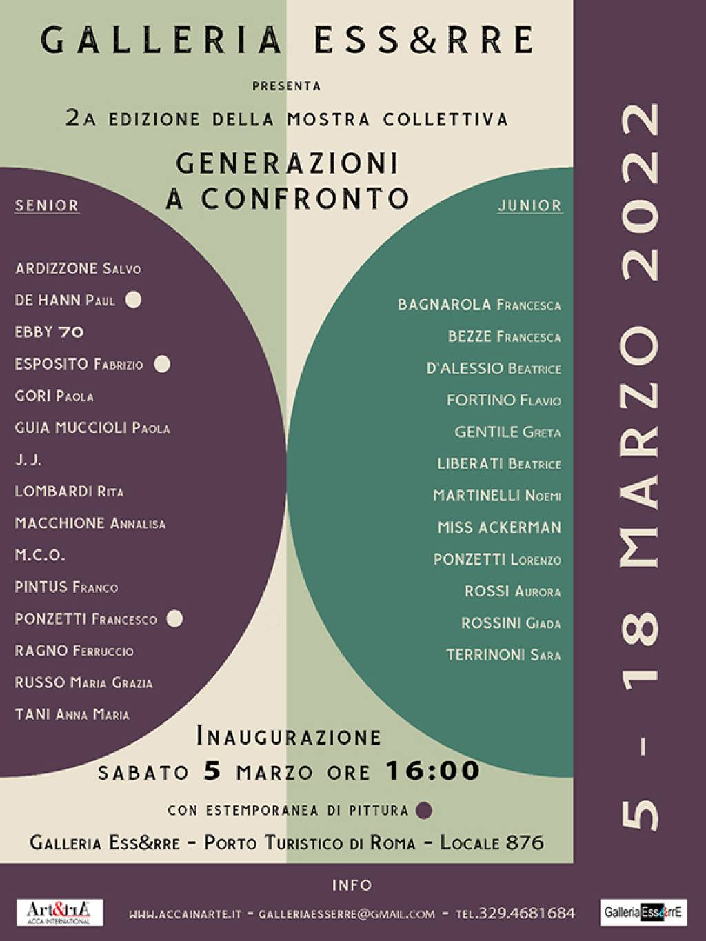 Nuovo appuntamento con “Generazioni a confronto” alla Galleria Ess&rrE di Roberto Sparaci, che nella programmazione primavera/estate al Porto Turistico di Roma presenta una nuova bellissima iniziativa in cui le diverse età artistiche si confronteranno tra loro e promuoveranno il loro modo di fare arte. In questo secondo appuntamento dedicato, alcuni artisti avranno inoltre, la possibilità di far conoscere il loro modo di “lavorare” con una bellissima estemporanea in cui il pubblico e gli interessati saranno parte integrante. Nelle diverse espressioni artistiche dove la mostra, curata da Alessandra Antonelli, promuove di fatto una stagione tra i più interessanti talenti della pittura e scultura e gli interessati e i collezionisti più raffinati, che da molti anni trovano consensi nelle varie generazioni artistiche che si affacciano nel nostro panorama espositivo, avranno modo di interfacciarsi con le opere e con gli artisti per trovare il giusto interesse e soddisfare ogni curiosità personale. La mostra allestita con particolare cura da Fabrizio Sparaci sarà vissuta in modo che i giovani artisti potranno fare loro i consigli e le tecniche pittoriche degli autori più esperti e quotati.