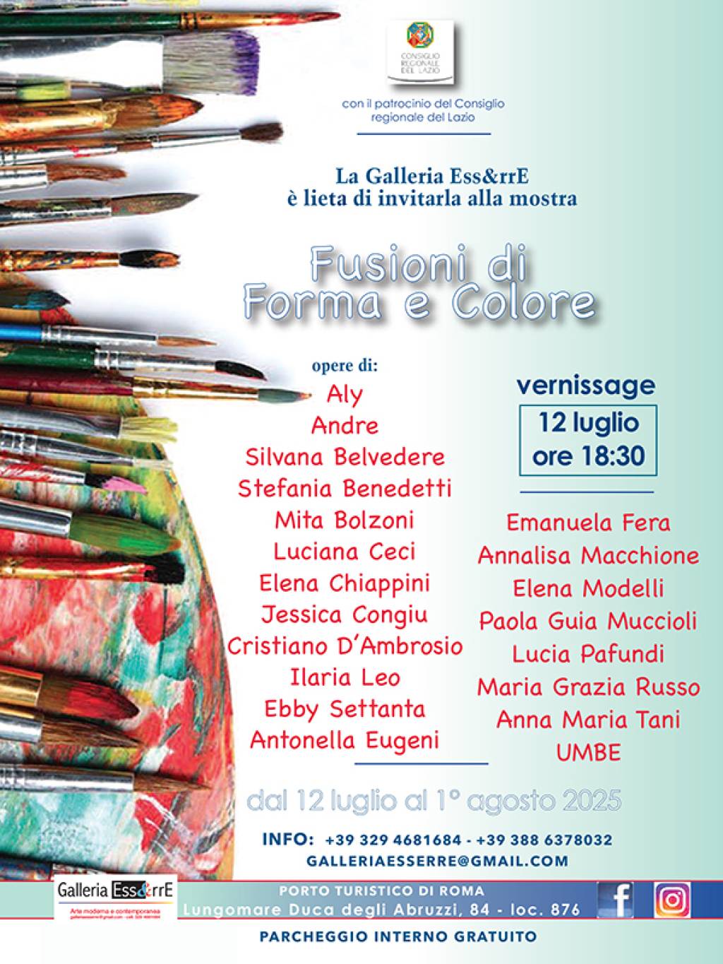 La mostra collettiva Fusioni di forma e colore, in esposizione alla Galleria Ess&rrE al Porto turistico di Roma dal 12 luglio al 1° agosto 2025, si presenta come un'esperienza visiva avvolgente e stimolante. Il titolo stesso suggerisce un approccio che cerca di unire, attraverso l’arte, le dicotomie tra rigore e spontaneità, tra geometria e fluidità cromatica. In effetti, ogni opera sembra porsi come punto di incontro tra linguaggi diversi, sfidando le convenzioni tradizionali e invitando il pubblico a rivedere le proprie percezioni visive.