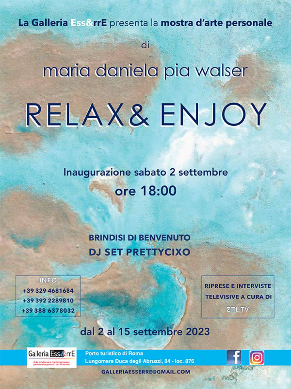 Dal 2 al 15 settembre 2023 alla Galleria Ess&rrE al Porto turistico di Roma, con le imbarcazioni che contornano la proposta culturale internazionale dell’artista svizzera Maria Daniela Pia Walser, apre i battenti alle ore 18:00 la mostra “RELAX & ENJOY” con circa 20 opere in esposizione selezionate per questo evento e mirate ai collezionisti ma anche solo ai curiosi della stessa, che saranno parte integrante delle scelte opportunamente fatte da Alessandra Antonelli, curatrice della mostra e da Fabrizio Sparaci allestitore della medesima con la supervisione di Roberto Sparaci organizzatore degli eventi espositivi.