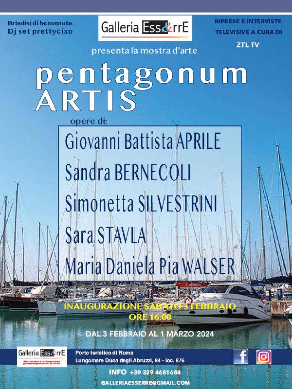 Pentagonum artis apre i battenti al Porto turistico di Roma a due passi da Ostia Antica che ha dato il giusto riconoscimento alla cittadina lidense proponendo, oltre al resto, le gite turistiche agli scavi romani per i numerosissimi visitatori da ogni parte del globo. Inoltre le pregevoli e sempre suggestive imbarcazioni che contornano i meravigliosi pomeriggi al Porto turistico fanno si che la Galleria Ess&rrE, con la proposta culturale con i cinque artisti selezionati da ogni parte d’Italia e oltre confine, fa della stessa scelta un ulteriore modo di intraprendere le passeggiate al Porto. Cinque pregevoli autori dell’Arte che dei loro lavori faranno una presentazione al pubblico presente.
