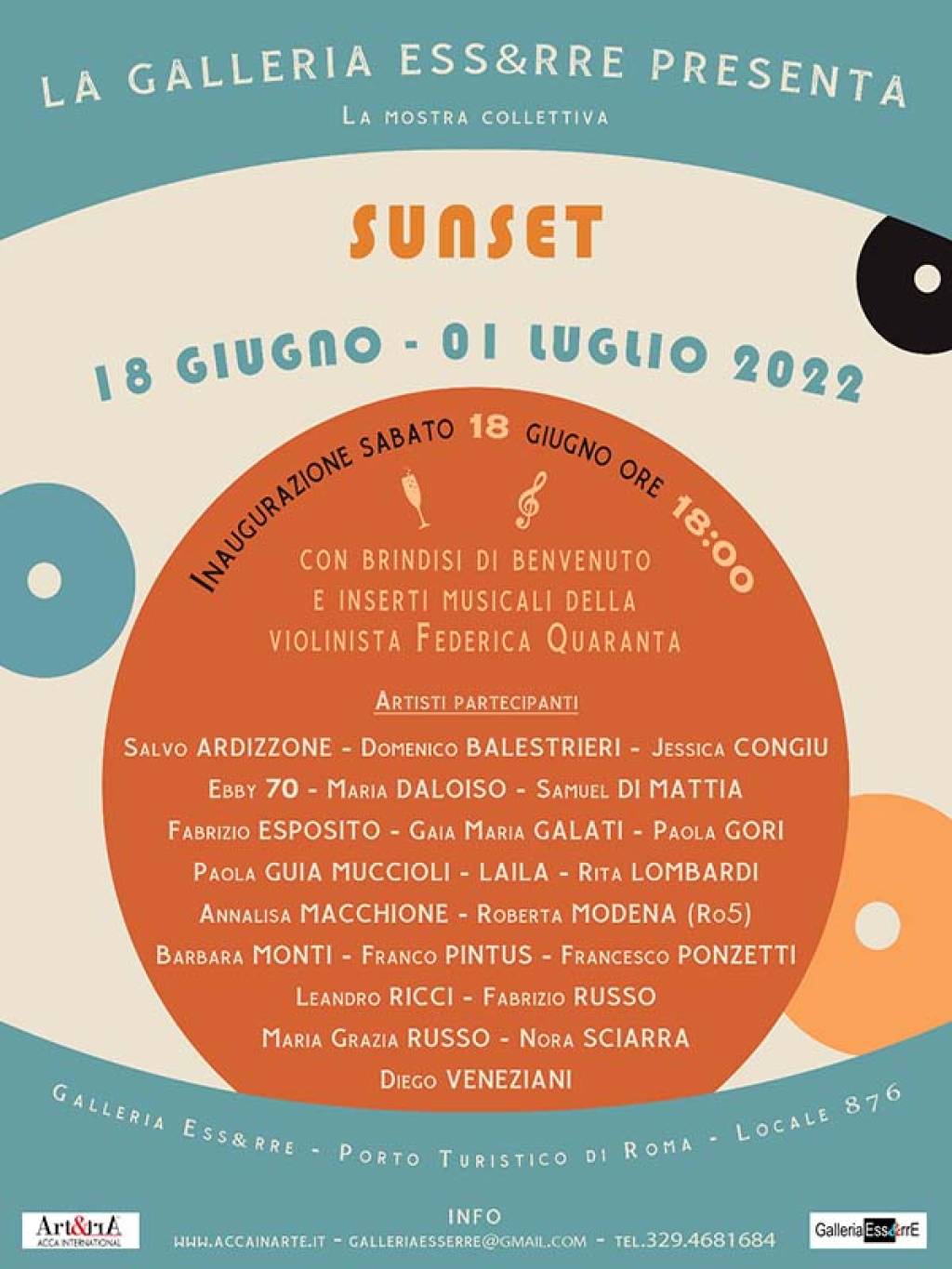 Altro importante appuntamento al Porto turistico di Roma con la mostra “SUNSET” con i seguenti artisti: Salvo Ardizzone, Domenico Balestrieri, Jessica Congiu, Ebby70, Maria Daloiso, Samuel Di Mattia, Fabrizio Esposito, Gaia Maria Galati, Paola Gori, GUIA (Paola Guia Muccioli), Laila, Rita Lombardi, Annalisa Macchione, Ro5 (Roberta Modena), Barbara Monti, Franco Pintus, Francesco Ponzetti, Leandro Ricci, Fabrizio Russo, Maria Grazia Russo, Nora Sciarra e Diego Veneziani alla Galleria Ess&rrE di Roberto Sparaci.