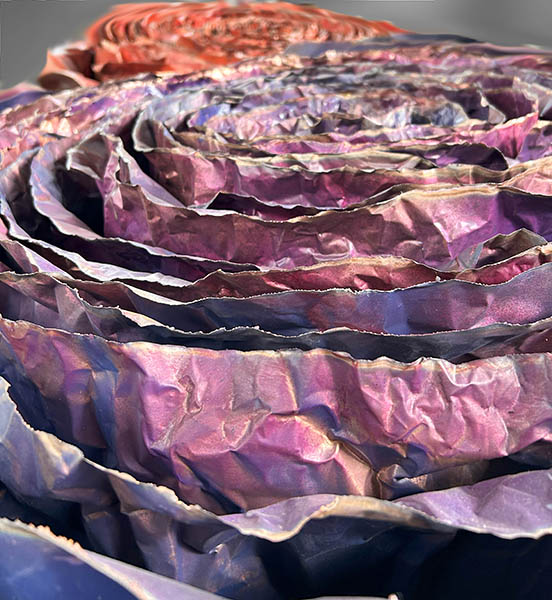 La prassi creativa di Francesca Leone si nutre della poetica del riuso, quindi recupera i materiali di scarto, soprattutto le lamiere cercate con insistenza nei cantieri dismessi e nei luoghi abbandonati, che testimoniano l’azione implacabile del tempo. Il tempo, che con il suo trascorrere imperterrito, ha eroso, arrugginito e ossidato la superficie delle sculture, assurge a coautore delle opere che l’artista modella e dipinge con cura.