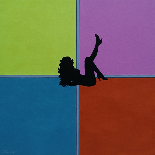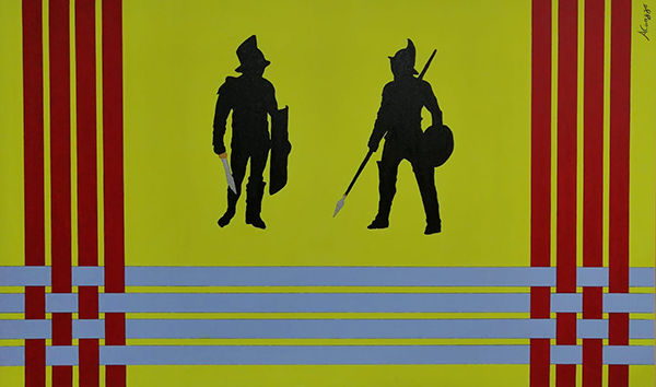 Quando staglia due massicce figure di gladiatori in una campitura gialla contornata da quegli ormai noti intrecci, quando sistema la figura della pin-up nel mezzo di un campo cromatico diviso in quadrati, quando affronta temi che la figura individua meglio, arriva a centrare con precisione e senza il dubbio interpretativo, insomma. Da qui l’esigenza di dare temi e titoli in linea, senza sbavature, inequivocabili. Perché ad Aku interessa lavorare sul tema della interazione senza lasciare largo e incontrollato margine di interpretazione all’osservatore. Gli piace porre il problema quanto risolverlo, e così ci si sente coinvolti in una serie di domande che facciamo a noi o a gli altri, in situazioni che abbiamo vissuto o vivremo, con quei due elementi (gli intrecci e le figure) che sono preponderanti, determinanti e indispensabili in pari misura.