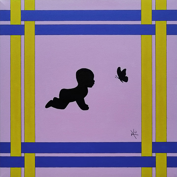 Così quell’intreccio, quel sovrapporsi di linee colorate che sanno di assi cartesiani e di ordine nitido per una pittura di giusto impatto diventano contorno e scenario, e nelle sue opere appaiono finalmente le figure. Corpi, oggetti, atteggiamenti facilmente individuabili che hanno il valore degli altri elementi dell’opera e non la fanno da protagonista. Semmai concorrono ad esprimere il tema primario, sono elementi fondanti ed aggiunti insieme. Il vero problema di chi, con l’arte, intende affrontare temi così profondi, da esplorazione esistenziale, è quello di rendere gradevole un’idea complessa, ed Aku ci riesce benissimo.