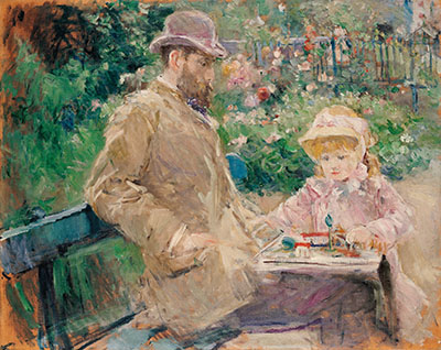 “Magicienne” dell’impressionismo, come l’ha definita Stéphane Mallarmé nella prefazione alla sua prima mostra postuma del 1896, Berthe Morisot immortala nelle sue opere istanti fugaci e intensi. La prima sezione della mostra, dedicata alla sfera familiare della pittrice, si apre con L’Autoritratto datato 1885 e proveniente dalla collezione del Musée Marmottan Monet di Parigi. L’artista, con pennellate veloci e briose, si raffigura con tavolozza e pennello in mano, all’apice della sua carriera. L’artista divide la sua vita tra arte e famiglia, come documentano i dipinti dedicati al marito Eugène Manet e alla figlia Julie, nata nel 1878. Mentre nei primi anni del suo percorso artistico ritrae principalmente i personaggi della famiglia d’origine come la madre e le sorelle Edma e Yves, dopo il matrimonio dedica prevalentemente i suoi dipinti a Eugène e Julie, da lei definita “una Manet fino alla punta delle unghie”. In Eugène Manet all’Isola di Wight lo sposo è immortalato, durante il viaggio di nozze inglese del 1875, mentre si trova in contemplazione davanti a una finestra, attraverso la quale si intravedono due figure femminili. In Eugène Manet e sua figlia nel giardino di Bougival padre e figlia sono raffigurati in una scena che denota l’affetto paterno verso la sua bambina.