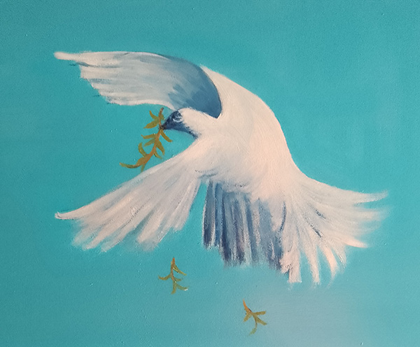Focolai di guerre, più profonde e incisive, stermini ed esplosioni, fuochi che si ergono nel cielo dei più deboli, probabilmente guerre non volute dai popoli, ma solo dalla brama di pochi. Un vivo ricordo di una citazione di Eliot: il mondo non finirà con un’esplosione, ma con un lamento lacerante. Eppure, in alto, una colomba si stacca e si eleva: questa è la speranza. Forse rappresenta il desiderio, forse la fede o la volontà degli esseri giusti e puri. Sicuramente, la possibilità della pace non deve essere un miraggio, ma la soluzione. L’artista Silvana Gatti con la sua tecnica dimostra una grande padronanza della tela attraverso il colore e la composizione narrativa, oltre a una netta linea dell’orizzonte tra cielo e mare. Il cielo e il mare, dipinti con toni di azzurro tenue, offrono un fondale di quiete e silenzio, quasi un palcoscenico rarefatto dove si consuma il dramma dell’interiorità e la speranza dell’anima. La figura inginocchiata, in contrasto, è trattata con pennellate più corpose e calde, che ne accentuano il senso di umanità. Il rosso del maglione non è solo un accento cromatico: è una ferita viva e lancinante, è l’urlo silenzioso del mondo che grava sulle spalle di ogni uomo cosciente, come per liberarsi del peso. Il globo è forse la parte più densa dell’opera: è il centro visivo e simbolico. Qui la Gatti inserisce dettagli, forme e simboli: la colomba ad ali aperte che spicca il volo tra le fiamme del globo, inviando rametti d’ulivo come segnale di pace. È un mondo frammentato, brulicante di conflitti spesso inutili per conquistare terreni aridi e rocciosi. Un mondo che, pur non coinvolgendoci in prima persona, ci appesantisce comunque: è il paradosso dell’empatia moderna, o forse il senso di colpa dell’occidente, che spesso pensa ad armi e sangue con il motto di esportare democrazia e libertà, osservando, consumando e portando sulle spalle i mali che ha contribuito a generare. L’opera è profondamente simbolica e di lettura esistenziale. La colomba è un segno di straordinaria potenza e di significato inequivocabile e universale. In un’epoca in cui il linguaggio visivo spesso indulge nell’ambiguità, la Gatti osa un simbolo limpido e biblico. Ma non lo fa in modo ingenuo: la colomba porta i rami d’ulivo, ma li lascia cadere uno a uno, come se non potesse portarli tutti, come se la pace dovesse essere condivisa, raccolta dal basso. Non basta che la colomba voli: serve che l’uomo sia disposto a sollevarsi, a cogliere i rami che cadono, a credere ancora nella possibilità di una riconciliazione, prima di tutto interiore e spirituale, affinché le anime possano incontrarsi. La figura inginocchiata è, in fondo, ognuno di noi che crede nella libertà altrui. C’è qualcosa di profondamente intimo in quella postura: non è solo un gesto di stanchezza, ma anche di preghiera e di evocazione al divino supremo. Quasi un atto penitenziale, o forse il momento prima della resurrezione che ci riporti alla terra. Non ci sono catene, né croci, ma il peso del mondo è sufficiente a piegare l’essere umano. Eppure, l’essere umano non è schiacciato: si inginocchia, ma non cade; conserva sempre la speranza e la fiducia. È qui che risiede la forza dell’opera: nella capacità di suggerire che, anche sotto il fardello del caos mondiale, possiamo ancora resistere, possiamo ancora sperare nel prossimo. Un’opera civile, spirituale e personale di Silvana Gatti che riesce in un’impresa rara: con un linguaggio pittorico semplice e accessibile, tocca corde profonde, quasi ancestrali. La sua opera è insieme civile, parla del globo; spirituale, parla della pace; ma anche personale, parla del grande cuore umano. Non è un’opera retorica: non ci sono slogan, non c’è ironia, non c’è cinismo. Solo il desiderio, autentico e struggente, che la pace è interiore e universale, che sia ancora possibile tra i popoli. In un tempo dominato dall’iperstimolazione visiva e dalla disillusione, questo dipinto appare quasi come un’icona contemporanea. L’artista con questa opera ci ha portato alla meditazione visiva sul nostro tempo. Una riflessione pittorica su quanto sia difficile trovare la pace dentro di noi, quando tutto intorno sembra precipitare. Eppure, nel cielo terso, la colomba vola ancora. I suoi rami d’ulivo cadono come promesse, come inviti. Non tutto è perduto. La pace è faticosa, sì. È un peso, spesso. Ma è anche una possibilità. Un atto di fede e un volo da seguire.