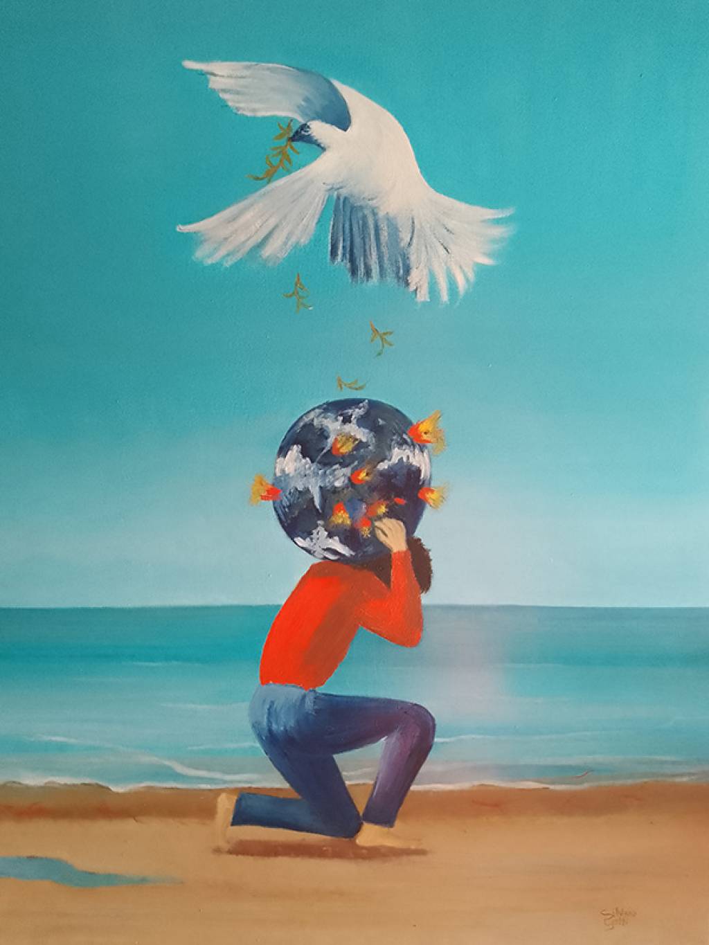 Con vero piacere mi dedico a questa riflessione e critica su un’opera così significativa. In questa opera dell’artista Silvana Gatti c’è un’immagine che si fissa nella memoria, una visione di una scena su una spiaggia che richiama il mare e gli sbarchi: un uomo, inginocchiato su una spiaggia deserta, con il peso del mondo sulle spalle, come fosse un fardello da cui liberarsi. Ma non è Atlante, né un titano punito dagli dèi; è solo un essere umano indifeso, con l’unica colpa di essere ridotto a un numero. È una figura moderna anonima, vestito con una maglietta di colore rosso, che simboleggia il sangue versato e che urla sotto il cielo azzurro, inginocchiato sulla sabbia come se pregasse la resa fragile, umana e sofferente. È l’anima collettiva del nostro tempo, in cui l’indifferenza fa più vittime della violenza subita. Sopra di lui, però, non si erge solo il globo terrestre, bensì qualcosa di molto più complesso: un mondo ferito, popolato da guerre, fiamme e minacce, ma anche da un gesto di speranza che si libra in volo con il simbolo di una colomba bianca, immensa, che porta nel becco rami d’ulivo come stelle cadenti. Questa è l’opera che l’artista Silvana Gatti ci consegna, e che si presta a una lettura stratificata, simbolica ed emotivamente vibrante. Un dipinto che potremmo chiamare, con licenza lirica e poetica, in cerca della pace. L’immaginario iconico: una scena sospesa tra mito, spiritualità e contemporaneità che la Gatti costruisce attraverso un’immagine, una mescola di riferimenti iconografici della tradizione cristiana come la colomba della pace, simbolo dello Spirito Santo con archetipi mitologici: il peso del mondo sulle spalle e la postura genuflessa, che rappresentano ormai la realtà odierna. La sensazione diffusa, palpabile, di vivere in un mondo affaticato, lacerato e fragile, dove la pace non è mai un punto di partenza, ma sempre un traguardo da rincorrere. L’opera è ambientata su una spiaggia, un litorale senza tempo, quella spiaggia che per molti è liberazione, ma che spesso diventa un calvario per i più. Mare e cielo si fondono in una calma apparente, quasi beffarda: l’orizzonte è sereno, ma dentro il globo che grava sull’uomo c’è tempesta.